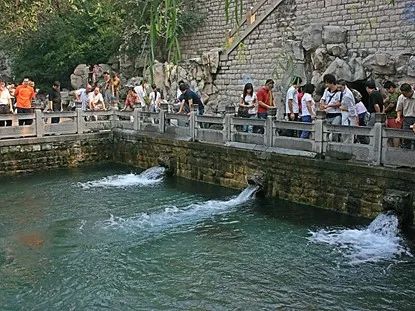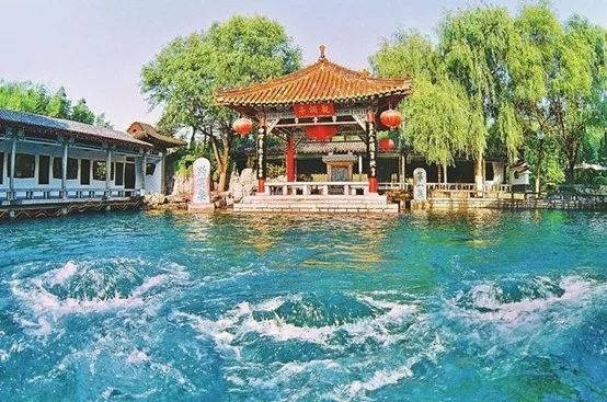 趵突泉居济南七十二名泉之首,被清朝乾隆皇帝誉为天下第一泉。三个出水口平均每天喷出7万股清澈见底的水流,温度常年保持在18℃。