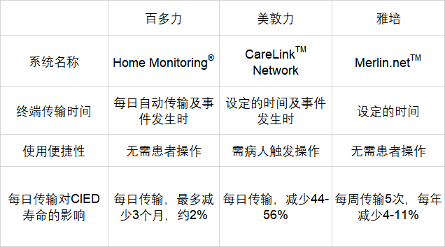 百多力的家庭监测系统:百多力是中国市场上最早推出远程监测系统的厂家之一。他们的家庭监测系统使用无线技术,可以实时传输心脏起搏器和患者的数据至医生端。该系统已在中国市场得到广泛应用,并得到医生和患者的认可。美敦力的Carelink系统:美敦力是全球领先的医疗技术公司之一,在中国市场也提供远程监测服务。他们的Carelink系统通过互联网传输患者的心脏起搏器数据,并提供给医生进行远程分析和监测。该系统在中国市场也开始有一定的应用和推广。雅培的Merlin系统:雅培是另一家在中国市场提供远程监测系统的厂家。他们的Merlin系统使用移动网络技术,可以将心脏起搏器和患者的数据传输至云端,医生可以随时访问和分析这些数据。该系统在中国市场也逐渐得到推广和使用。这三家厂家的远程监测系统在中国市场上的应用程度有所差异,但都在积极推动远程监测技术的发展和应用。随着技术的进一步改进和市场需求的增长,预计远程监测系统在中国市场将继续扩大应用范围,并为心脏患者提供更便捷和高效的随访服务。虽然不同的远程监测系统在使用形式上基本类似,但在终端传输时间、使用便捷性、每日传输对CIED寿命影响等方面存在差异。