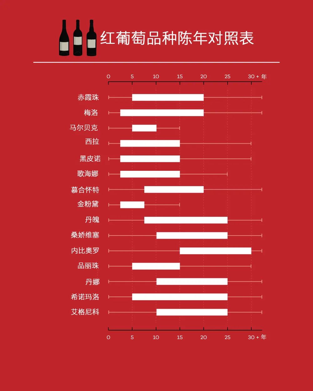 赤霞珠 由于质量水平和产区的不同而变化多端。选择颜色深、pH值适中偏低(如酸度较高)、酒精含量均衡且单宁明显的葡萄酒。 梅洛 你不会想到,梅洛和赤霞珠一样可以陈年。随着时间的推移,葡萄酒的口感会变得更加柔和,通常还会带有烟熏味(如烟草味)。波尔多右岸葡萄酒是陈年梅洛的最佳选择。 慕合怀特 具有极高的单宁和极深的色泽。在普罗旺斯的邦多勒(Bandol)产区,这种葡萄通常要经过至少10年的陈酿,才能品尝出其独特的味道。这款酒会散发出浓郁的胡椒和乡村风味。 丹魄 这是最适合长期陈酿的葡萄品种之一。里奥哈人深知这一点,并围绕陈酿建立了一套分级系统。 桑娇维塞 这是另一种适合长期陈酿的顶级葡萄品种,因为桑娇维塞具有辛辣的酸度。随着时间的推移,这种酒会变得更加醇厚,并带有无花果的甜味。蒙塔奇诺布鲁奈罗(Brunello di Montalcino)是值得珍藏的典范。 内比奥罗 巴罗洛(Barolo)和巴巴莱斯科(Barbaresco)产区在收藏家的脑海中留下了深刻印象,是寻找适合陈年葡萄酒的地方。为什么呢?内比奥罗酿造的葡萄酒单宁极高,但随着时间的推移,单宁会变得柔和,似乎还会有甜味。 西诺马诺(Xinomavro) 西诺马诺又叫黑熹诺,是希腊的一种新兴收藏选择,它让人联想到内比奥罗,最好的陈年佳酿单宁极高。 艾格尼科 艾格尼科的古老酿造方法使其在陈酿至少十年之前几乎无法饮用。这些葡萄酒带有腌制肉类和烟草的香味,非常诱人。