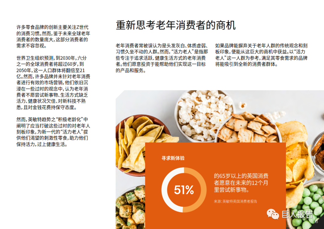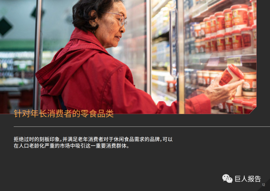 拒绝过时的刻板印象,并满足老年消费者对于休闲食品需求的品牌,可以在人口老龄化严重的市场中吸引这一重要消费群体
