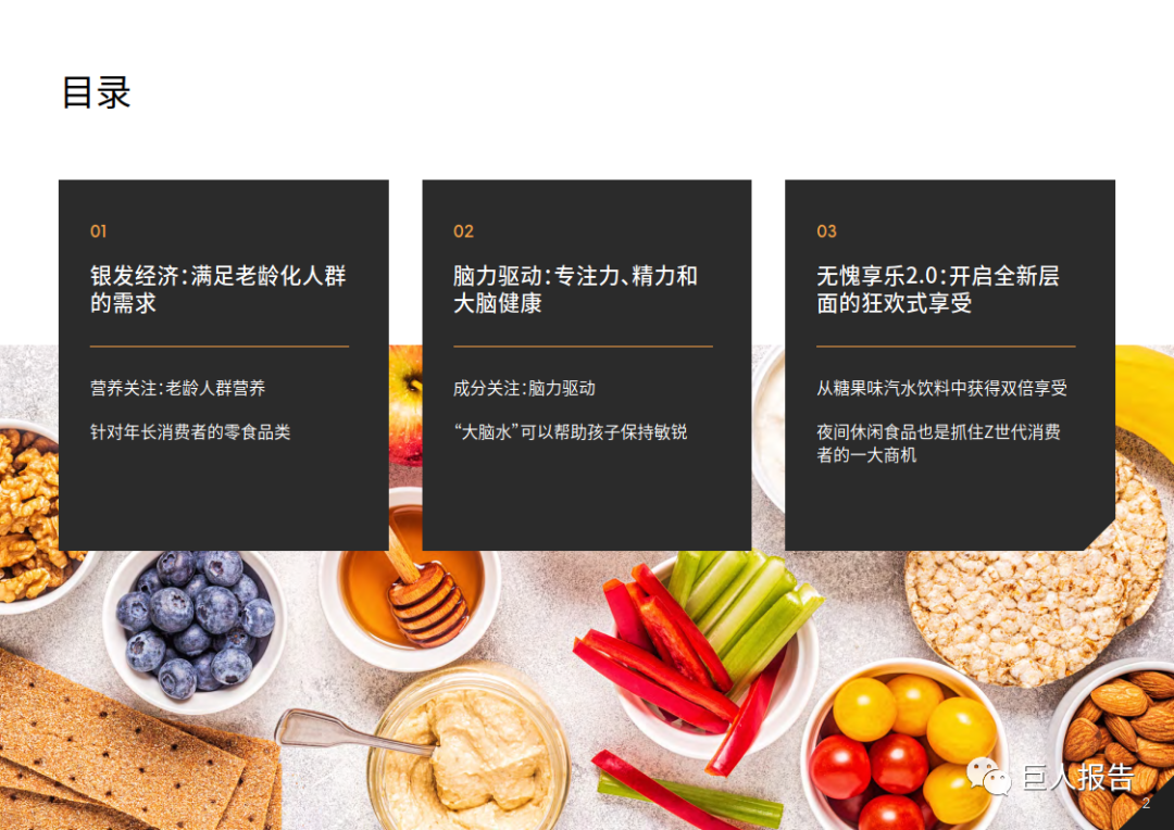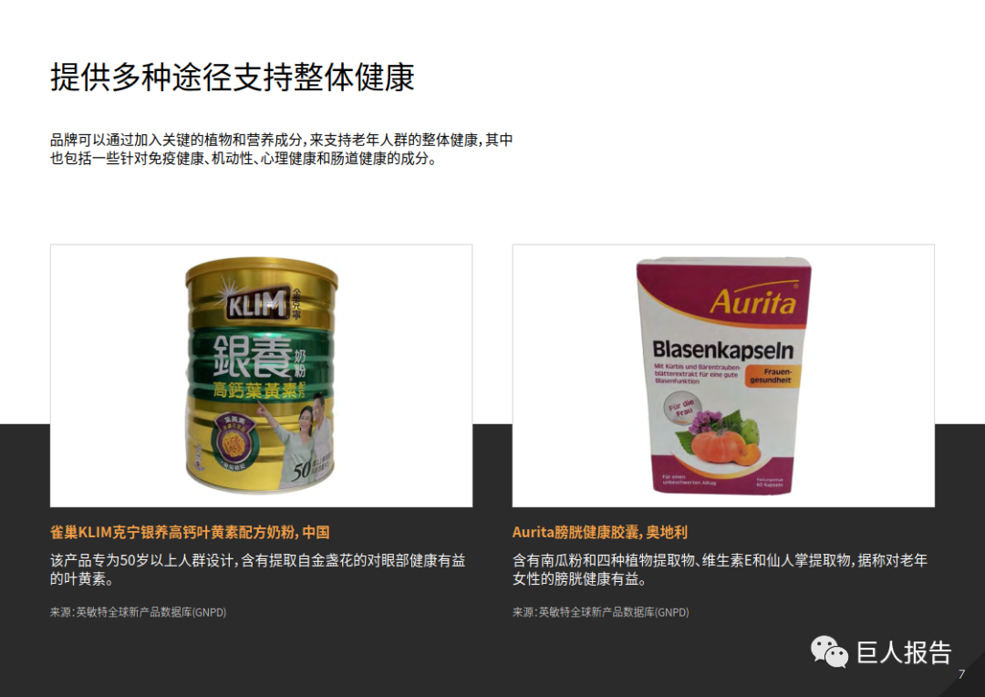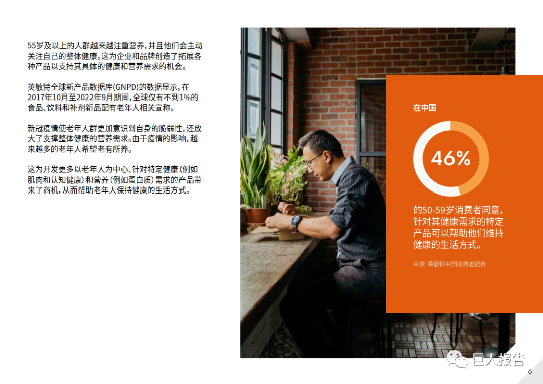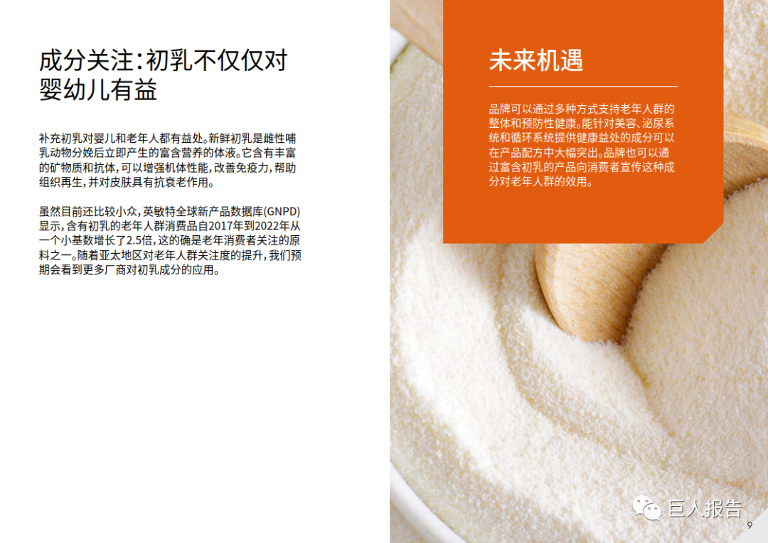 这为开发更多以老年人为中心、针对特定健康(例如肌肉和认知健康)和营养(例如蛋白质)需求的产品带来了商机,从而帮助老年人保持健康的生活方式。