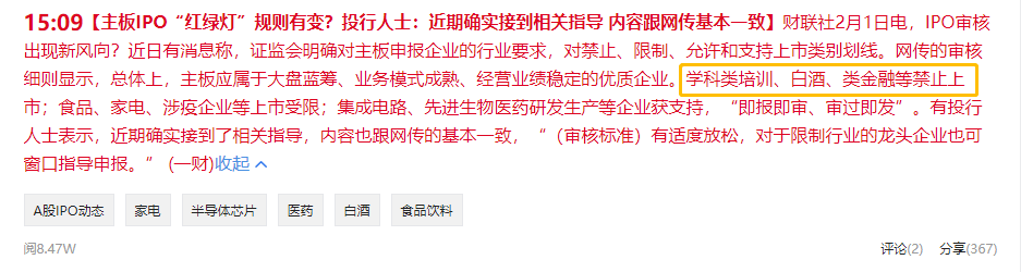 行业媒体分析,一是国家有意将更多资源引导到符合国家重大战略需求的高科技企业上。二是对白酒市场的一种保护,防止白酒企业大量上市,进而盲目扩张,破坏整个白酒行业的供需发展规律。