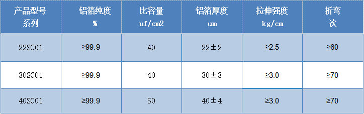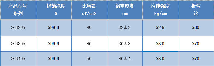 化学腐蚀超容箔使用1070铝箔原材料,含铝量≥99.7%;电化学腐蚀超容箔使用1090铝箔原材料,含铝量≥99.9%。冠业与铝箔供应商共同开发出用化学和电化学腐蚀方法制造的超级电容器用铝箔,各方面性能优异,已经得到很多超级电容器厂家的认可和喜爱。化学腐蚀超容箔产品有SCB205、SCB305、SCB405;电化学腐蚀超容箔产品有22SC01、30SC01、40SC01。