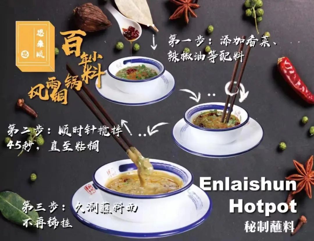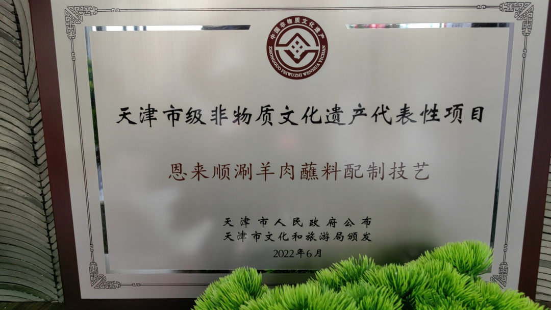 恩来顺涮羊肉蘸料:秉承着匠心精神,所有配料经过清洗、浸泡、熬煮、过滤等十几道工艺加工而成,每种调料在不同时间放入小火,熬煮时间不低于十小时,这也是恩来顺调料的精髓。2022年6月,恩来顺涮羊肉蘸料被评为天津市非物质文化遗项目,被百姓誉为涮羊肉伴侣。