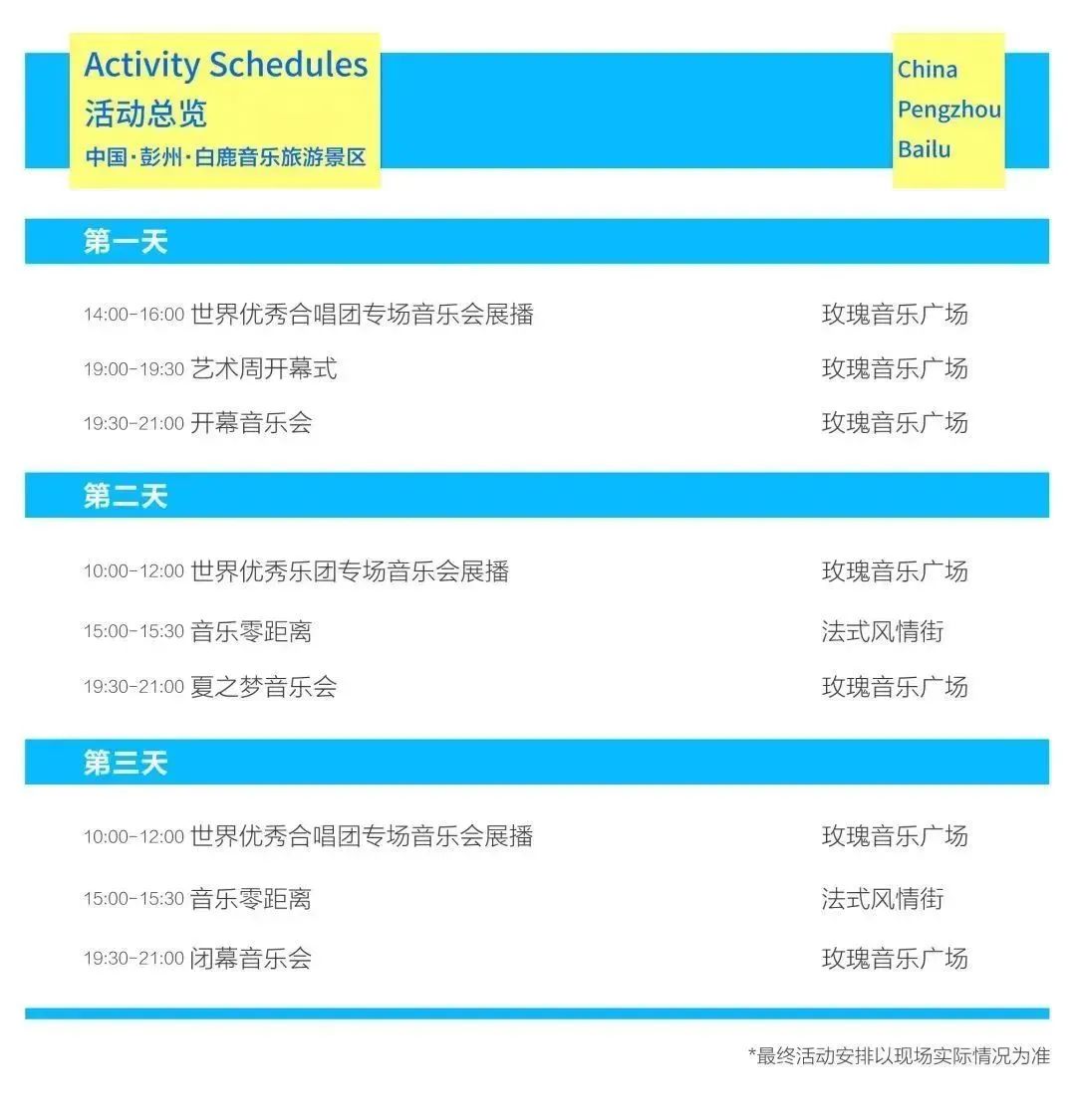 艺术周期间,将在玫瑰音乐广场每天播放一场世界优秀艺术团带来的云展播音乐会,让身处白鹿音乐旅游景区的你,时刻感受无处不在的音乐氛围。
