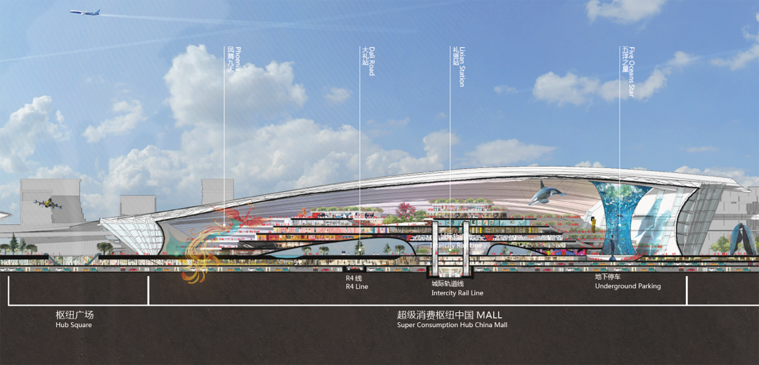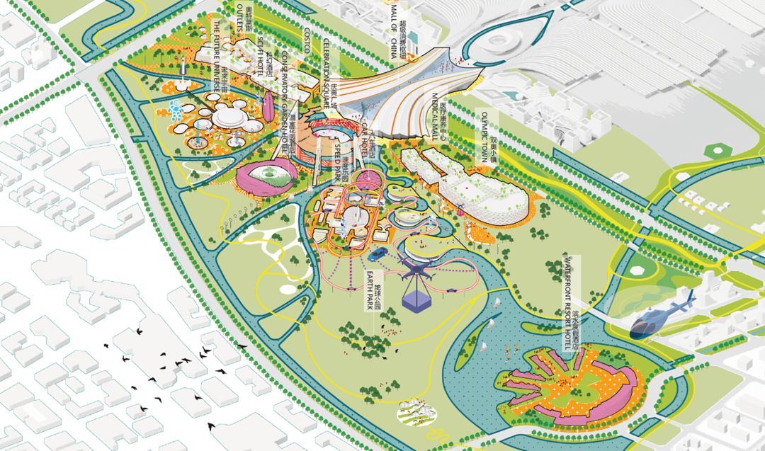 凤起梧桐 · 世界大兴:对于这样一个特殊区域,需要一个充满未来感、奇观汇聚、体验新奇的地方,才能为这里带来强吸引力。基于我们各种奇特的创意,结合运营、策划以及空间设计, 我们以具有落地性的方式让它们最大程度的融合,最终形成用地、空间、吸引力、项目运营、成本投入都具备可实施性的创意方案。