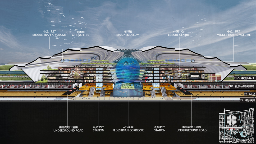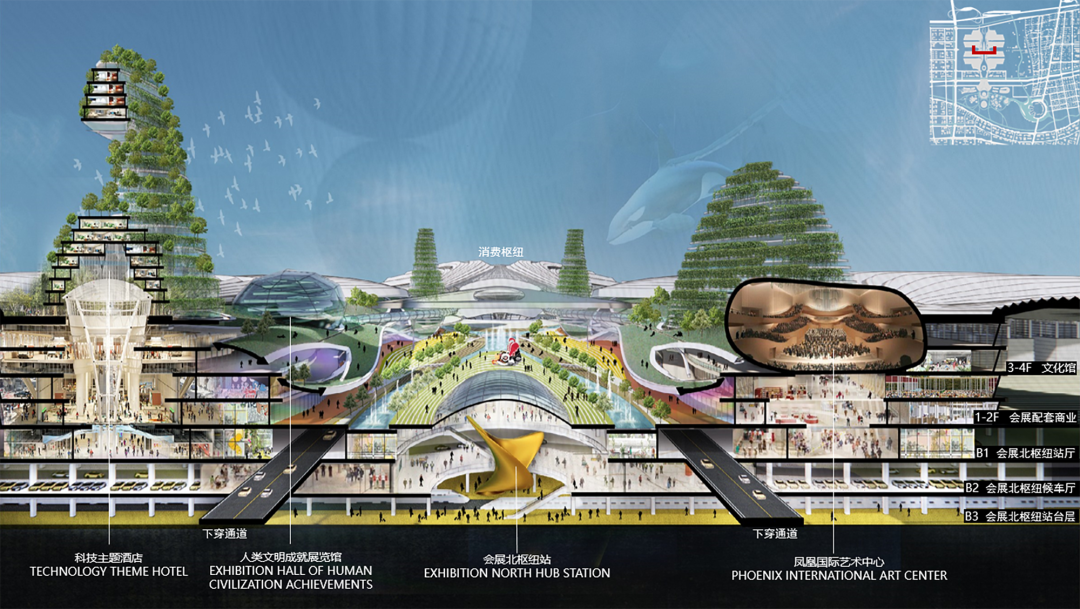 从北到南,形成双枢纽带动的活跃功能区域,以会展北枢纽为核心展开会展北登陆厅、国宾馆、科技主题酒店、未来之门地标以及凤凰艺术中心等;以礼贤枢纽展开奇观式的创意消费区域——主题消费区以及中国MALL,会展南登录厅,商务办公区、主题酒店等,整体形成展城融合的活跃轴线,带来丰富多样的极致体验。