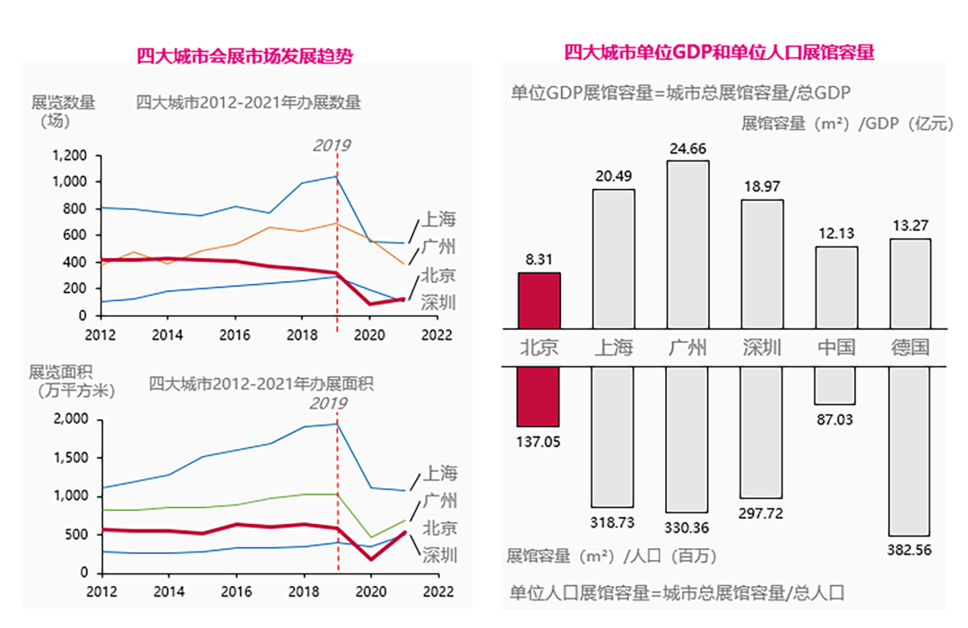 北京目前的展览市场规模及硬件与城市定位不匹配,整体市场发展、展馆人口容量等均位于末位。