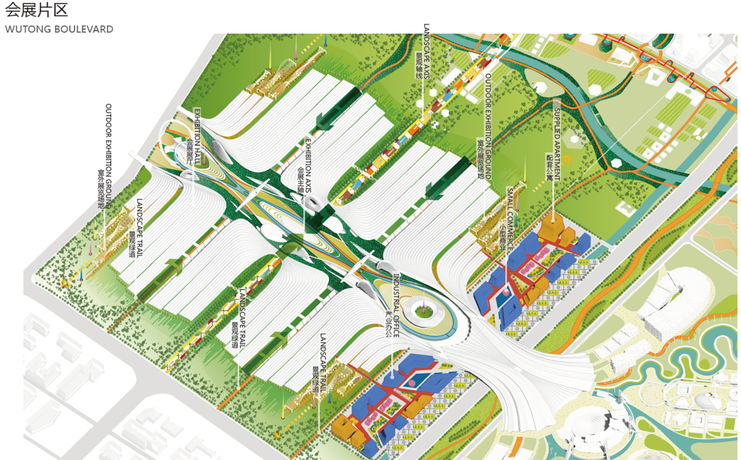 AUBE欧博设计以本项目的会展为核心模块,结合大消费板块的打造,植入商业、文旅等复合型功能,与会展进行有机融合、相互驱动的整体规划。