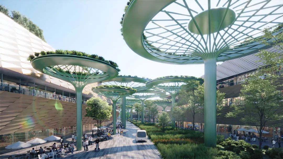 在这个规划创意中,我们希望城市功能的边界是隐藏的,城市呈现出在高度智能化之后,回归自然的景象。7.8平方公里用地,500万平方米开发规模中,包含会展会议、消费中心、交通枢纽、城市公园等多个超大体量的城市功能。是要在北京南中轴线上,大兴机场临空区,建设世界级的会展交往与消费中心。规划以贯穿南北的立体复合空间为超级枝干、双交通枢纽为核心,东西向发展轴为枝蔓,形成了自由弹性的树形空间组织,以复合高效的城市架构支撑城市动态生长的开发逻辑。