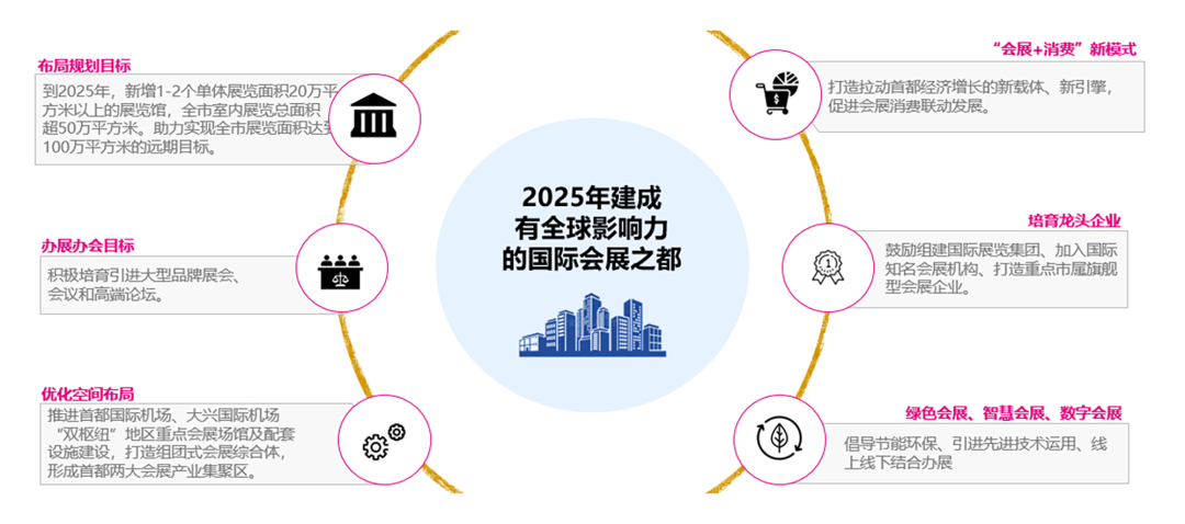 北京市政府出台多项政策支持会展业发展,目标在2025年建设成为有全球影响力的国际会展之都。基于此目标,北京市未来将大力发展会展产业,构建同城多馆格局。