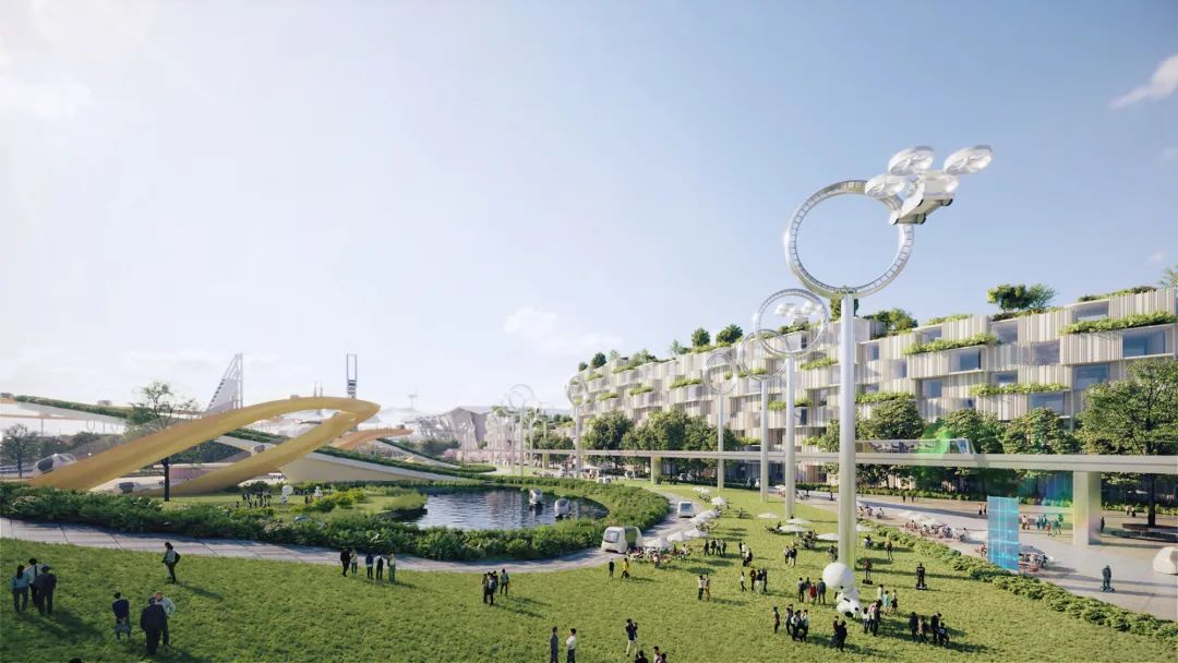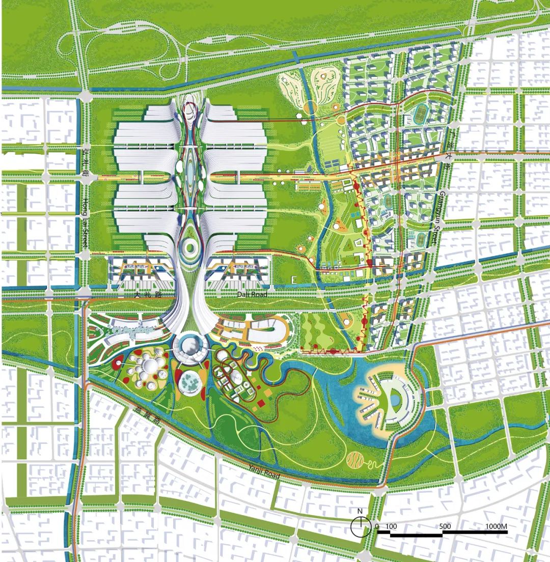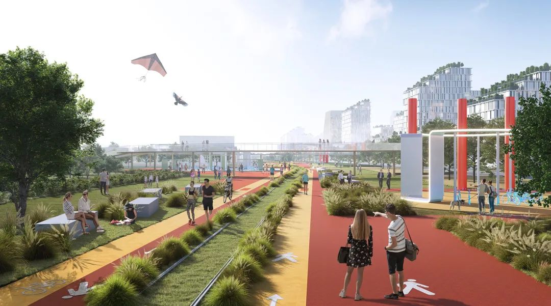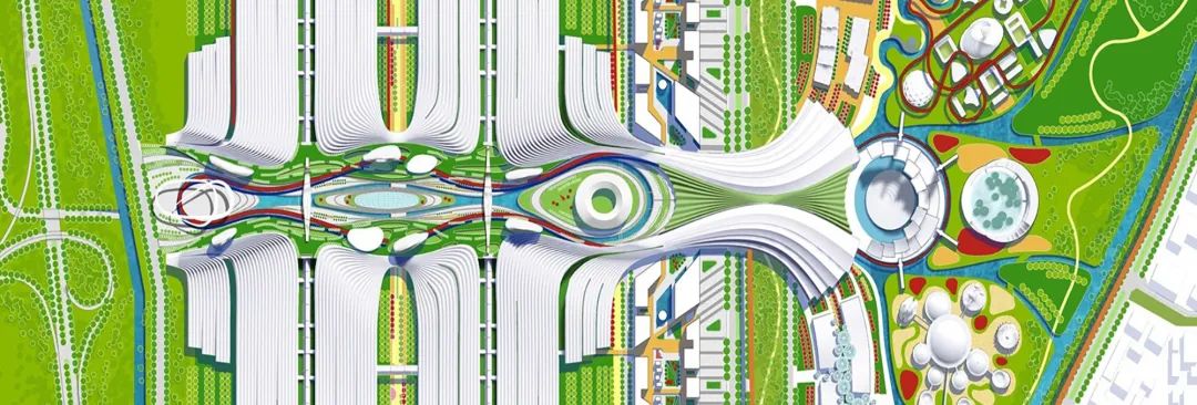 于是,那些超大尺度的城市功能互相融合,生长在以超级枝干为骨架的城市交通脉络上,“消失”在城市公园里。