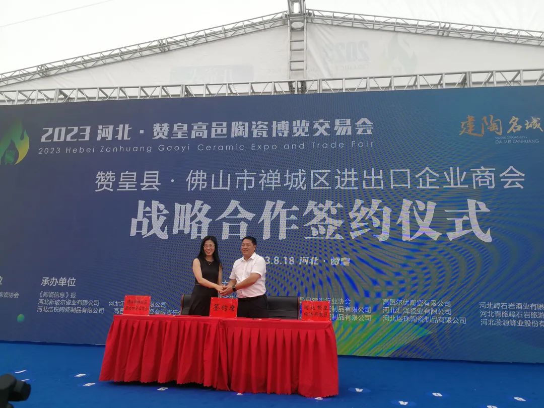 开幕式上,河北赞皇经济开发区与佛山市禅城区进出口企业商会签订了战略合作协议,双方以各自的人脉资源、建筑陶瓷产品出口渠道优势、专业技术和发展经验为基础,通过本次战略合作,在产品推广、技术交流、品牌运营、企业管理、人才引进、资本合作、项目引荐等方面广泛合作,帮助双方进一步拓展发展视野、改善工艺技术、提升运营效率、拓宽建筑陶瓷产品出口贸易渠道等,为双方创造更大的发展空间。