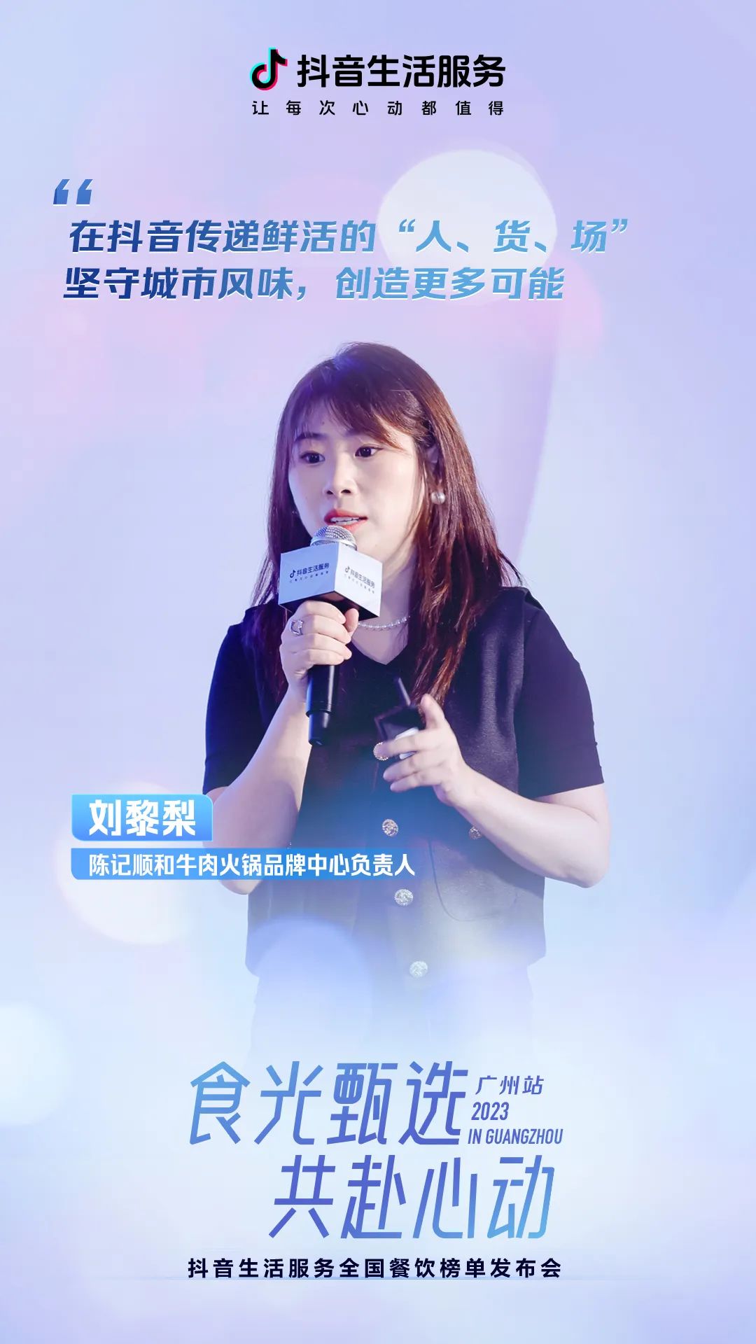 本次城市风味榜的评选中,广州共有40家商户上榜。陈记顺和牛肉火锅作为城市风味榜上榜代表商户做了主题为《与抖音生活服务传递潮汕鲜甜》的主题分享。陈记顺和牛肉火锅品牌中心负责人刘黎梨提到,尽管市场一直在变化,但陈记顺和始终坚守鲜、甜的品质和特色。除了食材是中国保持新鲜,品牌也时刻注意和消费者的新链接。通过品牌升级和平台扩容,链接新生代客群,在抖音持续传播品牌鲜、甜的“人货场”,通过打造品牌IP、创新组品策略、策划特色直播等方式,传播广州的特色风味,后续也会依托抖音城市风味榜创造更多品牌新生意新可能。
