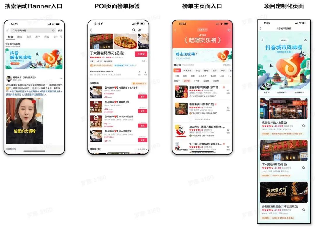 用户可搜索“抖音城市风味榜”查找各大城市的美食,上榜商户的poi也打上了榜单专属标签,得到官方的“盖章认证”。