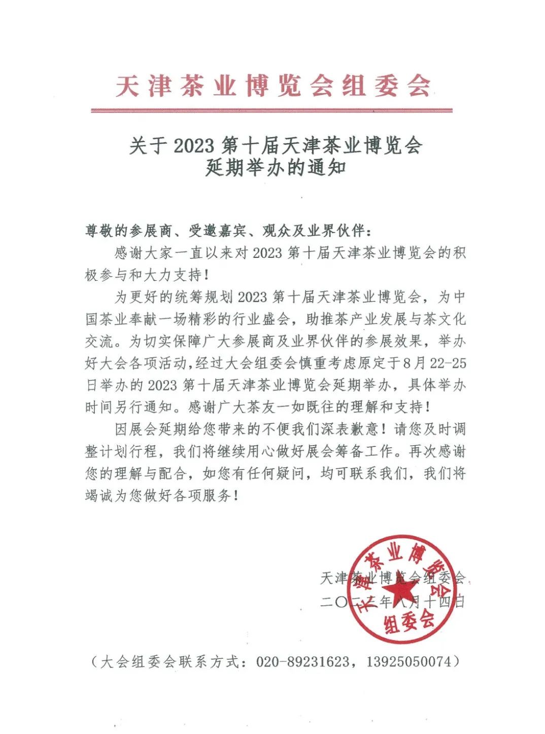 关于2023第十届天津茶业博览会延期举办的通知