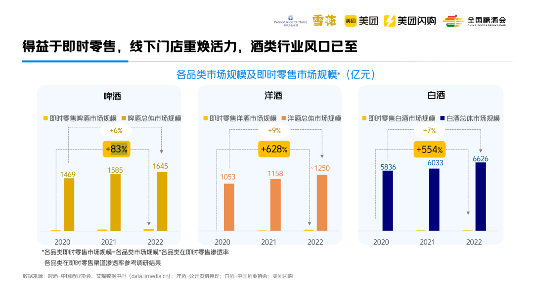 近年来,随着即时零售的普及,新的消费需求也在被释放,人们希望更快更便捷地获取所需。今年4月,美团闪购与全国糖酒商品交易会、华润雪花、保乐力加中国共同发布的《2023即时零售酒类白皮书》指出,2020年-2022年间,白酒即时零售市场规模增长554%。
