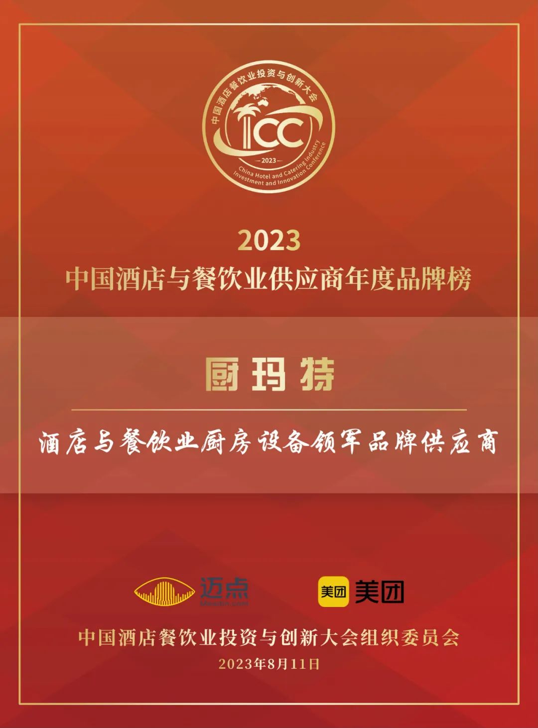 经过评审,厨玛特被评为2023年中国酒店与餐饮业厨房设备领军品牌供应商。