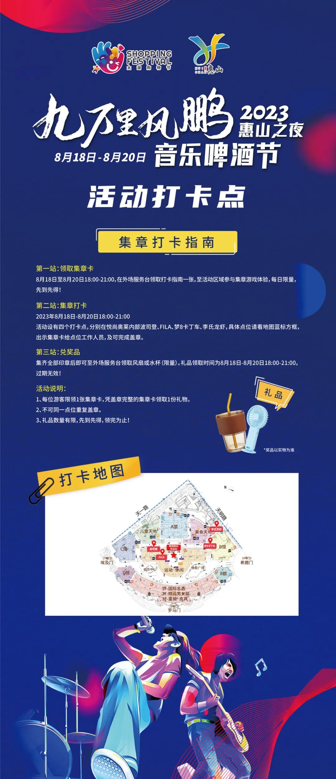 “服饰区域”“美食区域”“美妆区域”“游乐园区域”四个区域均设置了主题打卡装置,集齐四个区域全部印章即可兑换奖品!8月18日-8月20日活动期间,每天将发放无门槛抵扣消费券,可与现场摊位的各类优惠叠加使用。