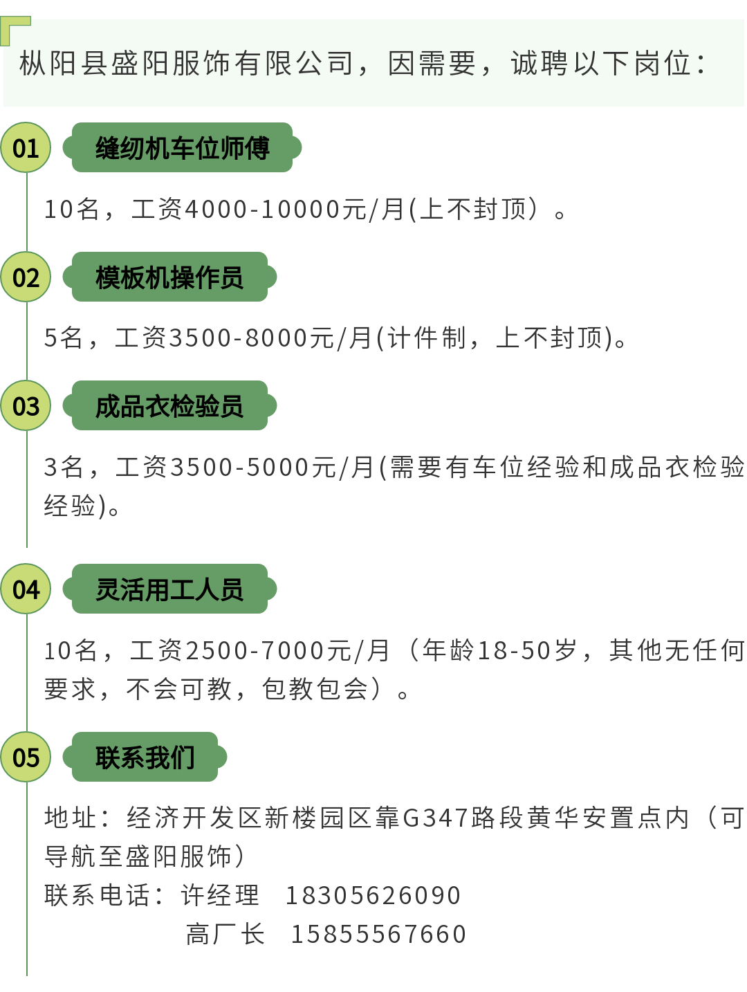 枞阳县盛阳服饰有限公司招聘公告