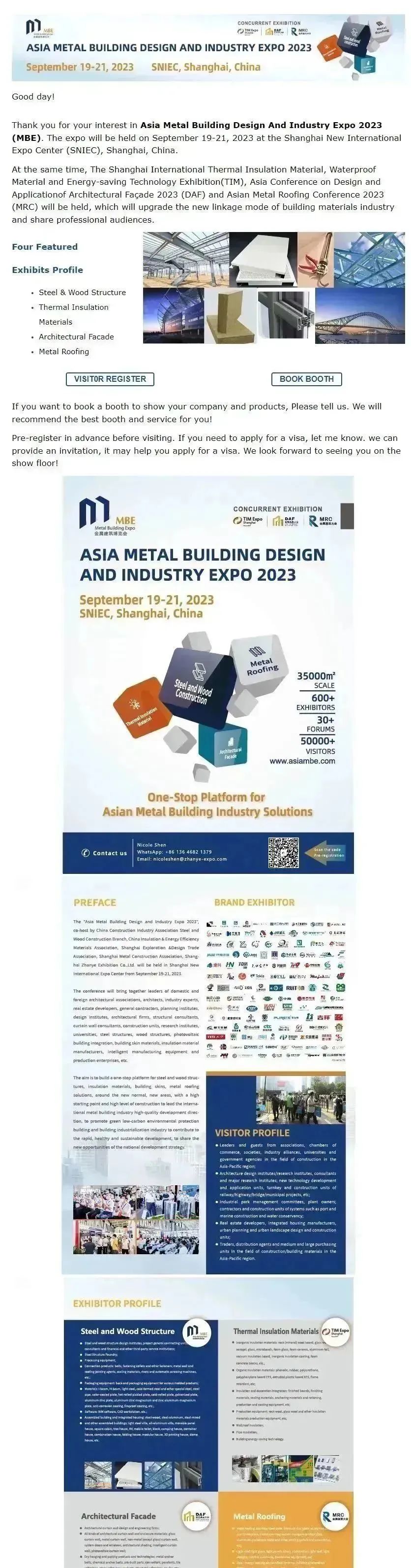 MBE将搭建一个高效、精准的产业对接平台,大力促进各国、各地区企业之间的资源对接,加深参展商与采购商的联系合作,推动金属建筑领域新产品、新技术不断革新,助力建筑建材产业跨越式发展。