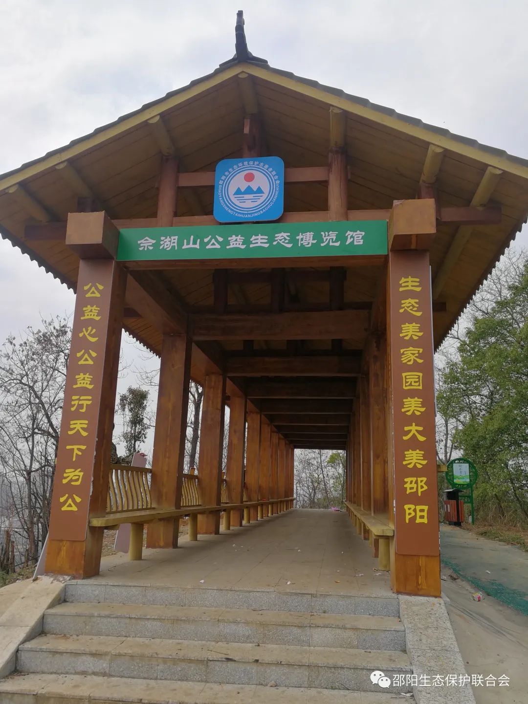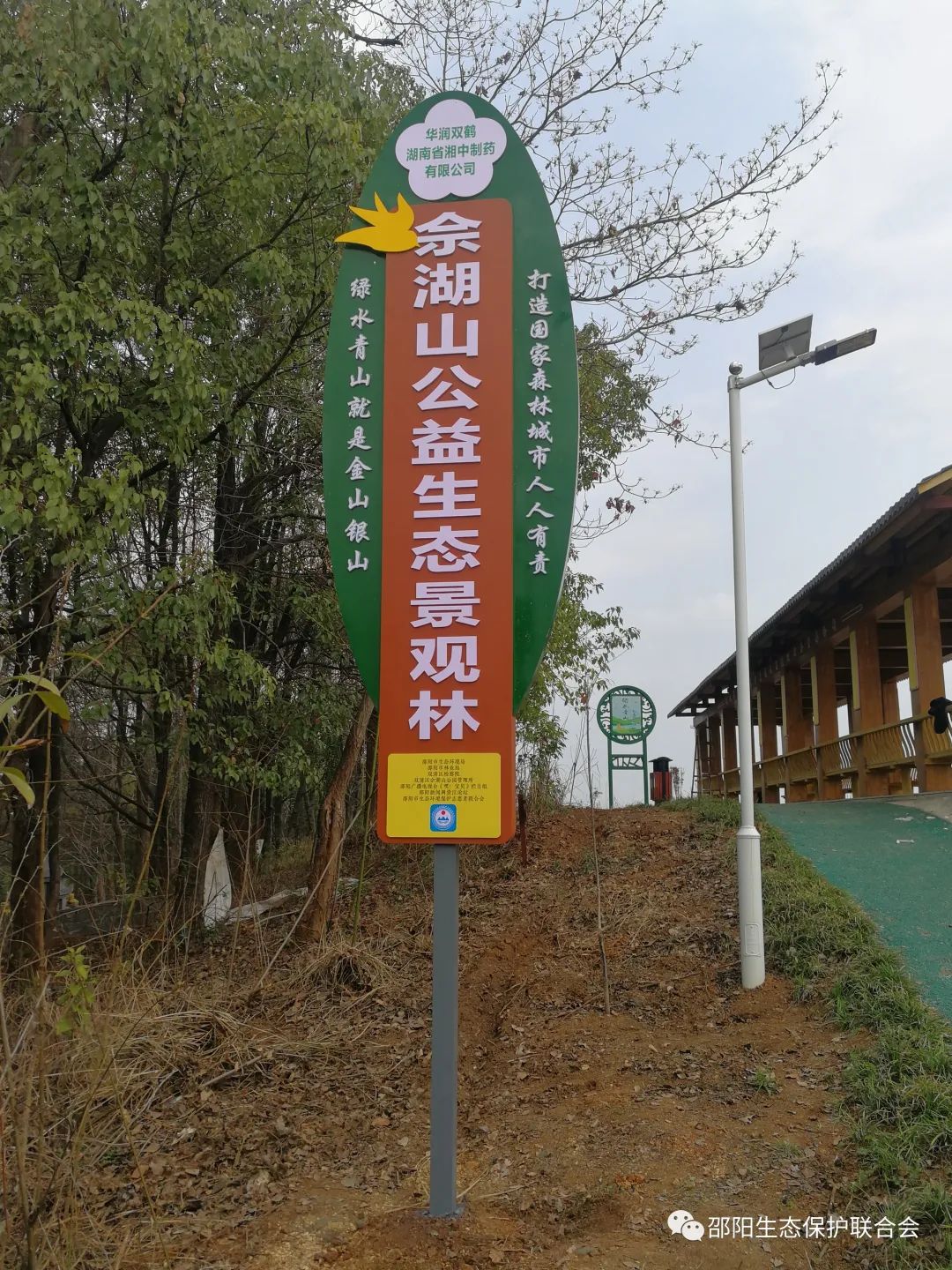 据该联合会秘书长胡浴明介绍,佘湖山生态景观林第一期工程20亩已完成,以八月金桂为主,辅以银杏、石榴、柏树、红豆杉等。同时,该联合会利用山顶景观长廊进行生态科普教育,已完成"生态博览馆"第一期工程。长廊南北两侧各十根方柱上,悬挂着习近平总书记关于生态文明思想"绿水青山就是金山银山"的重要话语论段20条。