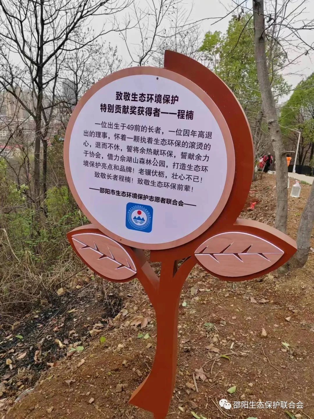 程楠原来是湘中制药厂(现华润双鹤湖南省湘中制药有限公司)工会主席,退休后一直从事各项公益事业。5年前,邵阳市生态环境保护志愿者联合会成立,程楠一次不落参加联合会组织的各种活动,成为联合会强有力的中坚力量。2022年,程楠积极奔走,终于促成爱心企业与民间组织的友好合作,在佘湖山公园打造一片公益林,建起一座"生态博览馆",准备打造一个集生态观光、生态研学、生态教育为一体的基地,实实在在为邵阳践行习近平生态文明思想、建设城市绿肺、打造全国森林城市添砖加瓦。