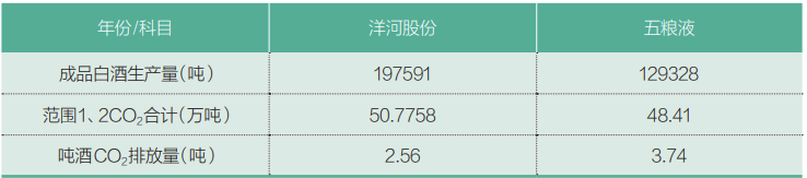在TOP5头部酒企之中,除了洋河股份,五粮液(000858.SZ)也在2022年ESG报告中,发布了温室气体排放情况。经核查,五粮液范围1排放量38.11万吨CO₂当量,范围2排放量10.30万吨,范围3上游原料运输间接排放量1.35万吨,范围1、2合计48.41万吨,低于洋河股份。但从吨酒CO₂排放量来看,洋河股份的指标则优于五粮液,见表3。表3:2022年洋河股份、五粮液碳排放强度对比