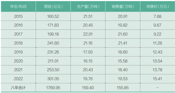 洋河股份拥有酿造规模世界第一的固态酒发酵基地,1000多个酿酒班组,7万多个名优酒窖池,原酒产能16万吨,成品酒设计产能30余万吨,储酒能力100万吨。目前,洋河股份的白酒年生产量、年销售量以及基酒存量,均是行业之冠。受制于白酒销售总量的见顶,洋河股份的生产量也已基本见顶,这意味着洋河股份的能耗及温室气体排放值已“基本达峰”。碳达峰是好事,但若其背后是发展停滞,那便得不偿失。洋河股份并非如此。表5是2015年-2022年间,洋河股份吨酒售价的变化情况。从中可以看出,八年间,洋河股份将其成品白酒的吨售价,从7.68万元提升至15.41万元,实现翻番。而这又得益于其产品的结构升级。表5:洋河股份成品白酒吨酒售价变化
