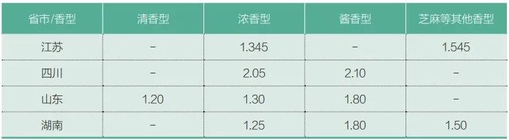 2022年,洋河股份共生产19.76万吨成品白酒。按原酒成品酒1∶1.5的勾调比例,约合原酒13万吨。在原酒生产中,CO₂的最大排放来源,一是来自蒸煮、蒸馏工序的化石能源燃烧,二是来自范围1的“过程排放”,酒精发酵时CO₂的理论得率,是酒精得率的95.6%。根据江苏省2018年发布的《单位能耗限额》,浓香型白酒企业每千升原酒的综合能耗,不能超过1.345吨标煤,见表2。表2:部分省白酒能耗标准(≤吨标煤 /千升65vol原酒)