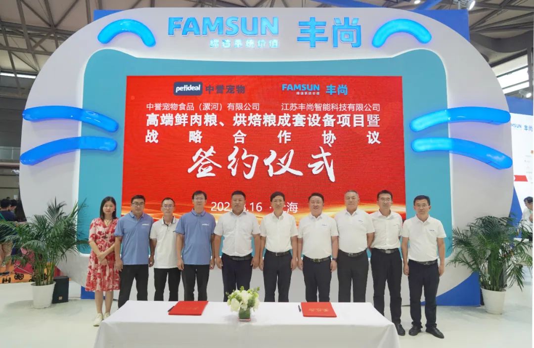 展会现场中誉宠物食品(漯河)有限公司与丰尚举行了“年产6万吨高鲜肉膨化粮、3万吨低温烘焙粮成套设备项目暨战略合作协议”签约仪式。为不断满足国内、国际不断增长的业务需求,以及研发和拓展品类的需要,中誉启动了占地面积约9万平方米的二期宠物食品产业园项目建设。经过多方对比及市场考察与交流沟通,中誉对丰尚领先的宠物食品加工设备、智能化工厂解决方案、专业的研发交付团队、全方位的服务支持留下了深刻印象,最终选择了具有丰富宠物食品工程经验的丰尚,这是中誉对丰尚在宠物食品装备领域实力的高度认可。