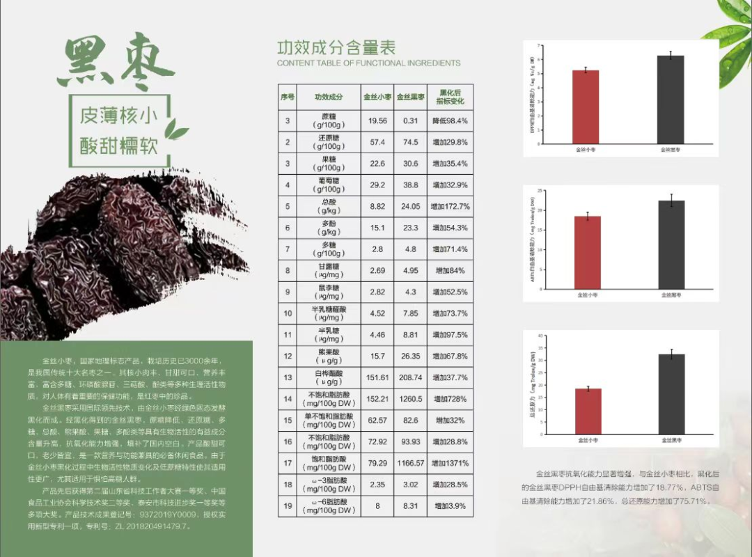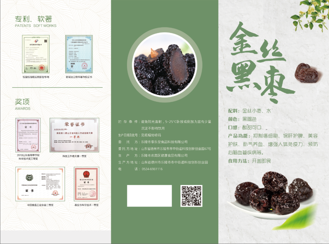金丝黑枣多糖先后获得第二届山东省科技工作者大赛一等奖、中国食品工业协会科学技术奖二等奖、泰安市科技进步奖一等奖等多项大奖。国家技术发明专利号:ZL 202110273661.1。