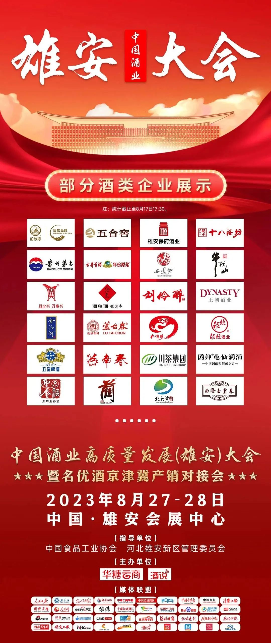 目前,茅台、古井贡、西凤、牛栏山、丛台、五合窖、保府酒业、衡水老白干、全兴酒业、酒鬼酒、刘伶醉、王朝酒业、金汾河、芦台春、九龙醉等知名酒企深度参与雄安大会,还有更多实力酒企积极对接中。