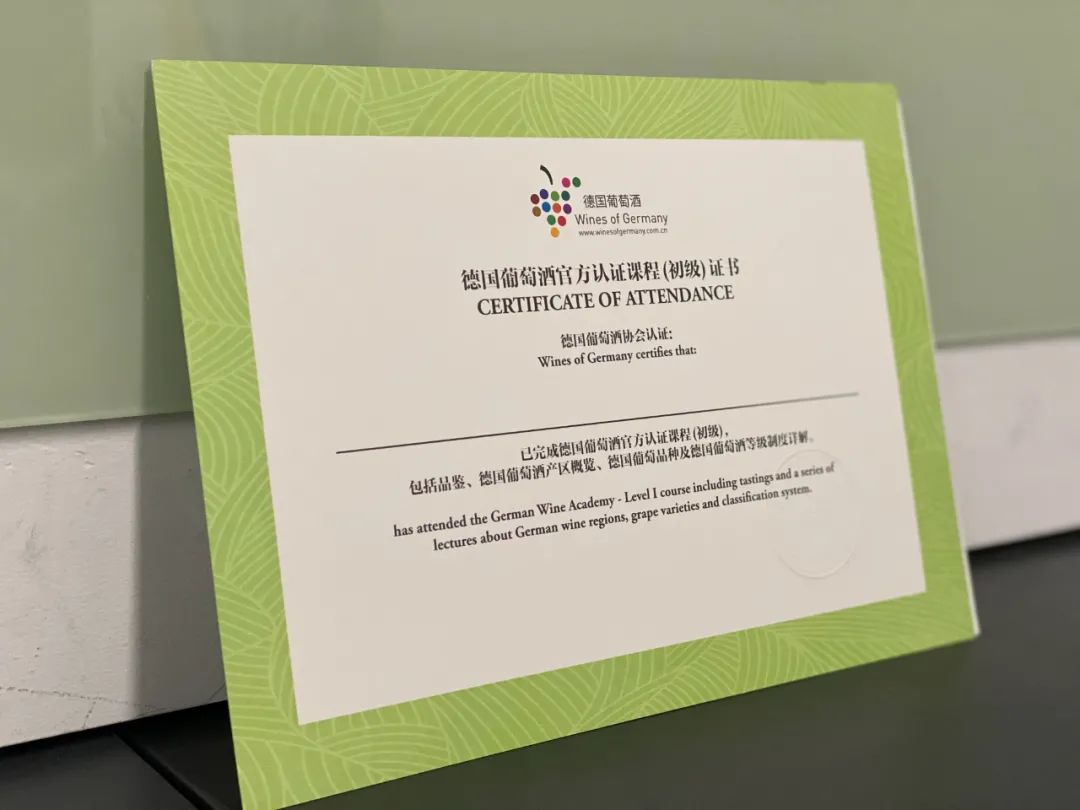 课程完成后,无需考试,学员即可获得由德国葡萄酒协会颁发的官方认证课程证书。