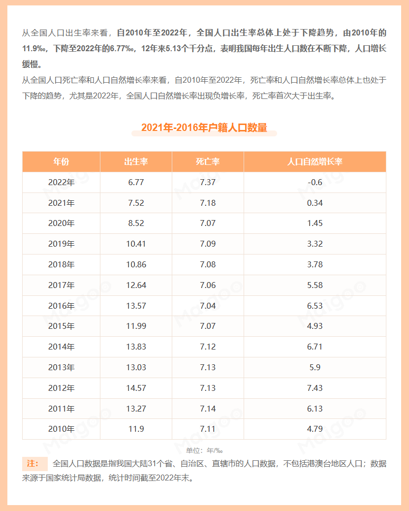 2022年,我国出生人口956万,人口自然增长率-0.6‰,是自建国以来第一次出现了负增长。按照14亿人口基数,去年一年中国人口减少数量是84万人,更严峻的是人口负增长呈现加剧的趋势。