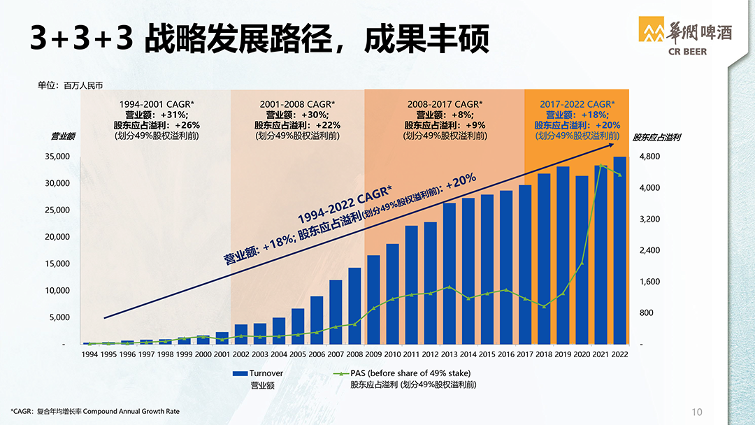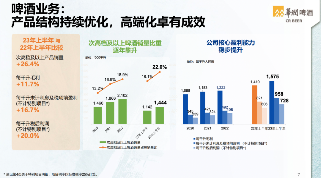 在当天举行的业绩会上,华润啤酒(控股)有限公司董事会主席侯孝海表示,上半年国内啤酒市场处于高端化和经济性双轨并进的状态,但经济性消费抬头并不意味着啤酒高端化趋势发生了改变。同时,在本次半年报中,华润啤酒也首次公布了白酒业务板块的业绩表现,侯孝海表示,目前国内白酒行业仍在深度调整期,白酒应该回归其消费品的本质,而不是去做奢侈品。华润啤酒董事会主席侯孝海(中)手捧金沙高端酱香白酒品牌“摘要”产品尽管当下无论是啤酒还是白酒行业都面临下行的压力,但是侯孝海坚定表示,华润雪花啤酒做“啤酒新世界领导者”的战略目标坚定“两个不动摇”。对于华润系已拥有的“三瓶白酒”(金沙酒业、金种子、景芝),侯孝海一口气用了8个“坚持”,强调华润啤酒排除噪音、勇做白酒新世界探索者的决心。值得一提的是,“啤+白”是华润啤酒做世界一流酒企的重要战略布局。而刚刚敲开白酒大门的华润啤酒,如何做好白酒是外界关注的焦点。如今,金沙酒业已经并表,对于华润啤酒的白酒业务,成为本次业绩说明会上媒体关注的焦点。根据华润啤酒半年报显示,金沙酒业上半年实现营收9.77亿元,未计利息及税项前盈利为7100万元,“如果剔除因收购贵州金沙所产生的无形资产摊销的影响,白酒业务未计利息及税项前盈利为3.95亿元。”华润啤酒董事会秘书梁伟强在交流会上补充道。“上半年通过对金沙酒业的组织再造,产品升级和品牌焕新,以及系统性的经营管理体系的梳理和进一步的规范,通过6-7个月的工作,金沙酒业的进展超出预期,整体库存下降了1/3,价格恢复明显。”侯孝海表示,上半年根本性地改变了金沙酒业过去一些弱项和不足,随着下半年产品升级和品牌焕新工作的完成,金沙酒业未来会呈现出全国性发展的动力。侯孝海还提到,“白酒行业仍要坚持对历史文化和品质主义的传承。”在这一方向下,华润啤酒的白酒业务要“坚持做正确的事情”。侯孝海在会上一口气用了8个“坚持”表示,华润酒业进入白酒领域坚持长期主义和品质主义,要坚持做正确的事情,坚持做正确的品牌、坚持做正确的产品、坚持正确的渠道、坚持正确的价格、坚持正确的库存管理和坚持正确的消费者培育。“现在大家觉得白酒处于调整期,存在增长困难的问题,有很多说法。我们管理团队也曾经用一句话来宣誓华润做白酒的信心,那就是坚定战略自信、坚持战略定力、坚定不移地落实三年业务发展策略,从探索、学习再到变强,排除一切噪音,勇做白酒新世界的探索者。”侯孝海说。而问及后续的并购计划,侯孝海表示,在今年增长是第一策略,市场消费信心不足的情况下,目前会先专注于消化已经收购的白酒项目,未来对于并购会更加谨慎。本次交流会也是侯孝海首次以董事会主席身份,就业绩报告与媒体进行分享沟通。同时,2023年也是侯孝海制定的3+3+3战略中第三个3年实现“决胜高端”战略目标的开局之年。“如果今年按照上半年的增长态势,下半年即便三季度消费受到抑制,我们有信心实现次高端啤酒今年双位数增长,并有望在今年或明年实现次高端以上的中国啤酒销量第一。”侯孝海对于华润啤酒高端化发展信心满满。