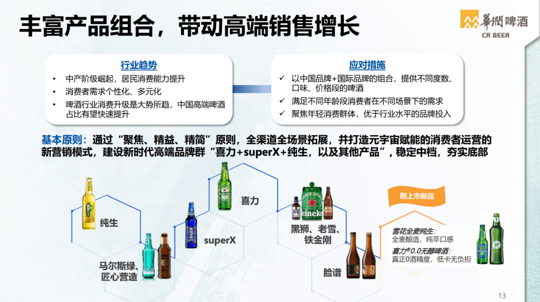 而按照华润啤酒会制定的“3+3+3”战略,次高端以上产品的销量要大于等于350万吨以上,超过主要竞争对手,成为中国高档啤酒销量第一。按照侯孝海的预期,超越百威中国市场份额,华润啤酒可能要提前两年完成。另外,据名酒观察了解,今年上半年,华润雪花次高档及以上啤酒的销量占比首次超过20%,国际和本土品牌均有高速增长。其中,中国次高端及以上品牌增速超过20%,而国际品牌增速要较此快2-3倍。在名酒观察看来,这也一定程度表明,华润啤酒团队经过三年实践,已经掌握了啤酒高端市场的有效战法。侯孝海进一步谈到,国际品牌拥有过百年历史,品牌价值和高端化形象沉淀更深厚,而中国品牌仍需时间来建设。在高端产品中,中国品牌目前占比更高。如果朝未来五年或更长远看,10块以上的高端国际与中国品牌销售贡献或五五开。他还提到,眼下啤酒市场呈“双轨并进”的态势,即高端化快速发展、经济型啤酒增长较以往有所复苏。“这就使得我们对整个啤酒业务要两手抓,两手都要硬,就是一手要抓高端化,一手要抓经济性,夯实底部。”侯孝海说,“我们整体(高端化)打法没有太大调整,只是比过去更重视底部规模,但这并不更改公司进军高端化的主力方向。”在会上,他直言华润啤酒上半年的不足之处,一是小部分市场未能坚决落实进一步夯实经济型啤酒的策略,错失上半年底部放量的机会,令对手在该价格区间的销量得到增长。另一个不足之处则是在黑龙江、吉林、广东、山东的表现不及预期,这些是华润雪花想拿下更多高端乃至啤酒份额的省份。“展望2023年下半年,增长将继续作为华润啤酒的第一策略”,这是华润啤酒中报中的原话。将坚持“增长、重构、求精、均好、规则”的发展方针,增长是放在第一位的。“华润啤酒致力做大规模、提升质量、夯实底部、适度调整价格、精益费用及精准管店”,要“争取实现2023年全年均好增长”。此次交流会上,侯孝海用“均好”二字点题,这或许也是华润酒业新世界的“均好”路线,正确的路线。在名酒观察看来,“均好”并非是华润啤酒决胜高端的“退堂鼓”,而是华润啤酒释放出未来酒业“啤+白”新世界的“均好无短板”的决心,不论啤酒和白酒,都已是充分竞争,企业不可能依靠一两样关键资源打赢、获胜,增长是第一策略,那“均好”就是重视高质量增长、重视综合竞争力。