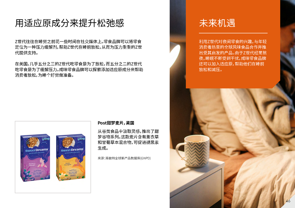 Z世代往往在睡觉之前花一些时间在社交媒体上。零食品牌可以考虑利用适应原成分,将产品定位为一种压力缓解剂,帮助睡前放松,从而为压力重重的Z世代提供支持。