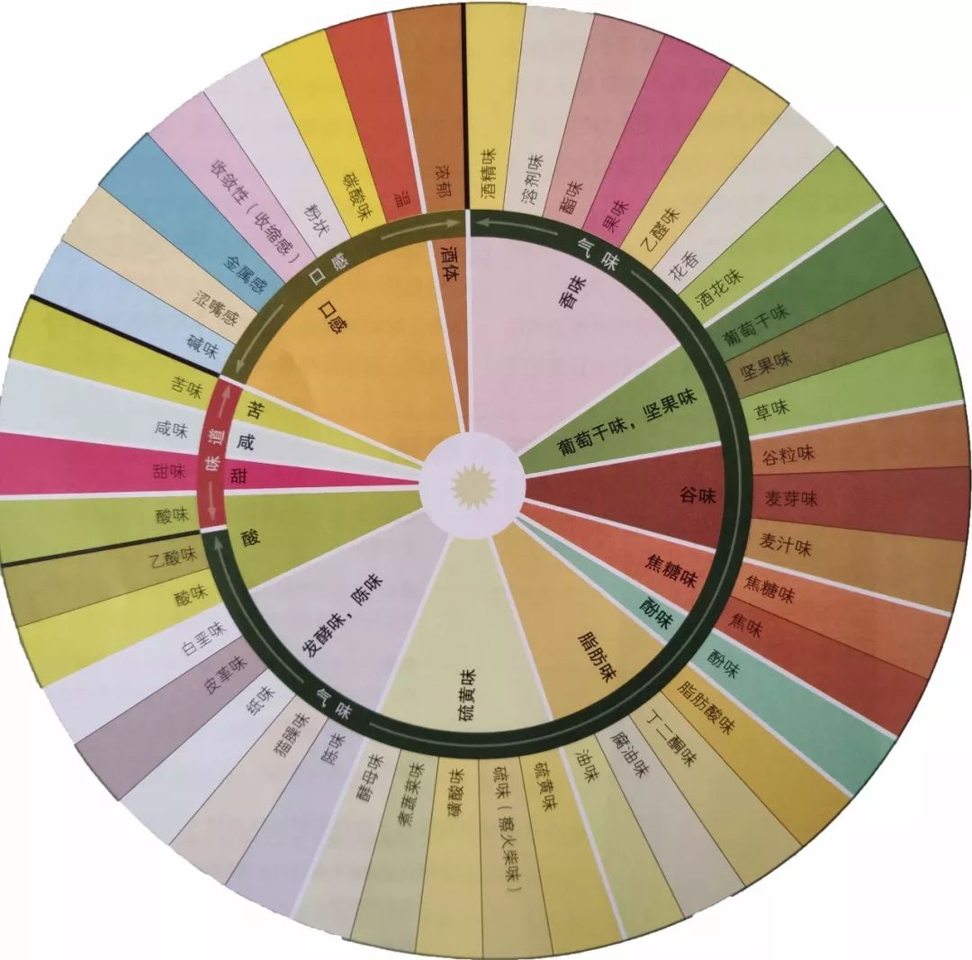 小编也找了个啤酒风味圆盘,从香气、口感、味道 3 方面来描述啤酒风味: