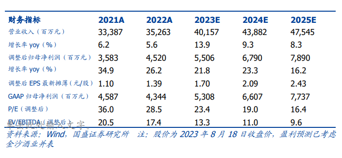 盈利预测:考虑到金沙酒业并表,我们预计公司2023-2025年调整后归母净利为55.1/67.9/78.9亿元(原为59.3/70.8/83.6亿元),同比+21.8%/23.3%/16.2%,当前股价对应PE为23/19/16x,我们看好公司啤酒业务高端化持续推进、白酒业务整合后贡献新增长,维持“买入”评级。