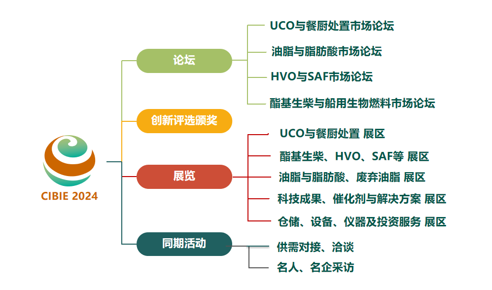 作为中国乃至亚洲范围内最权威、最具影响力、最高品质的生物能源产业盛会,CIBIE 2024分别设置了四大主题论坛:UCO与餐厨废油市场论坛、油脂与脂肪酸市场论坛、HVO与SAF市场论坛和酯基生柴与船用生物燃料市场论坛。