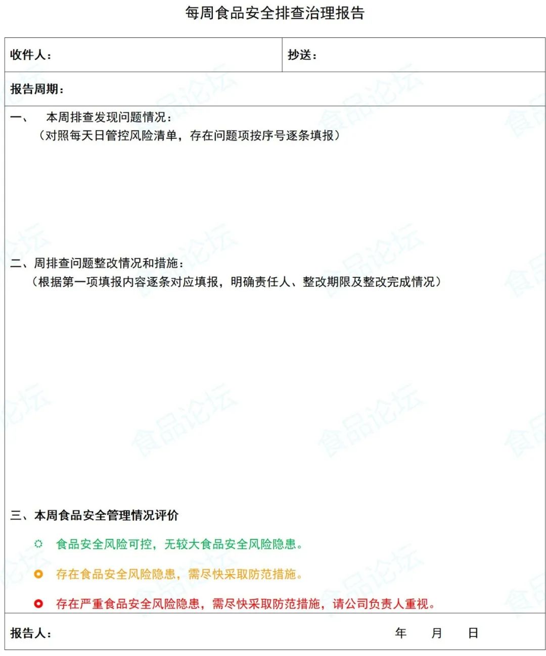 4.3.3对于周排查形成的《每周食品安全排查治理报告》,应及时上报至店长或总部食品安全总监,抄送相关责任负责人,使其知晓存在的食品安全风险,督促相关责任人采取相应的管控措施,确保食品安全风险可控