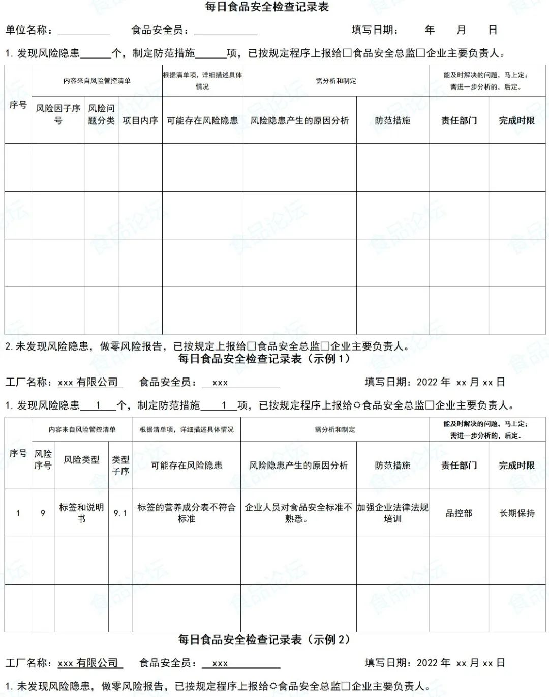 4.2.2正常营业期间,食品安全员每日根据《风险管控清单》进行检查,排查加工或销售各个环节可能存在的食品安全风险隐,并将检查结果汇总记录在《每日食品安全检查记录》表上,可采用电子表格的形式予以记录。未发现问题的,也应当予以记录