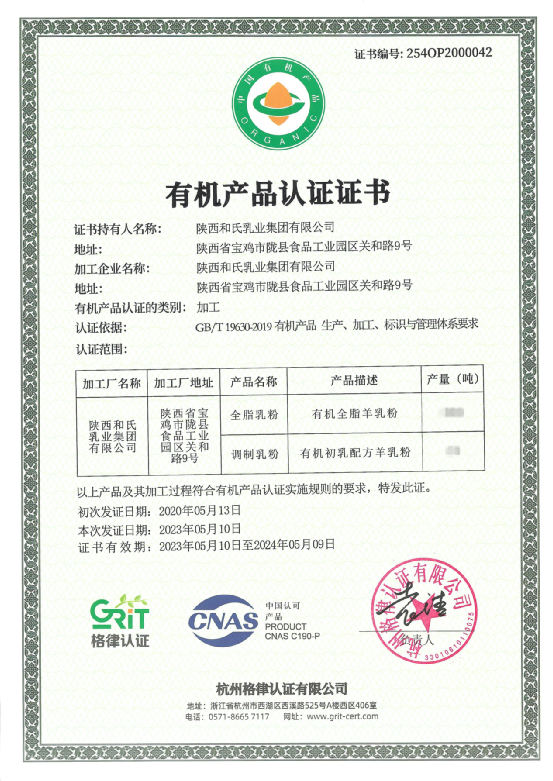 和氏乳业2款产品,获得国家有机产品认证!
