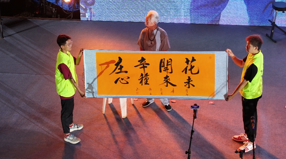 活动现场,王茂德老先生现场挥墨,题字“花开辛庄 未来种心”,只见这幅字遒劲有力、行云流水、落笔如云烟,引发观众啧啧称赞。