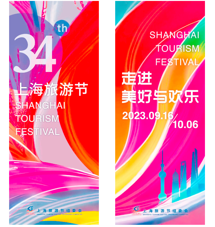 2023上海旅游节主视觉形象:设计主题为“第34届上海旅游节•走进美好与欢乐”,选取上海旅游节经典LOGO标识的“飞鸟”造型为视觉基础,并通过流动的线条进行变幻演绎。通过色彩、线条、图形等多种视觉符号的表达,让每一位在大街小巷邂逅它的你,都能感受到上海旅游节的多姿多彩、欢欣鼓舞。