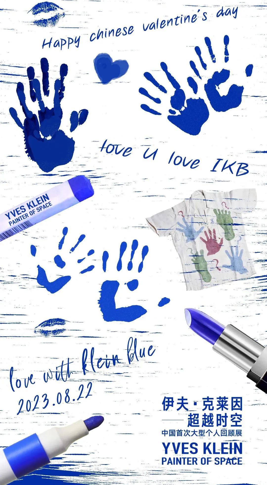 爱,值得铭记。七夕当日,浪漫有迹可循,爱的氛围仪式感UP!!我们在《伊夫·克莱因——超越时空》展厅出口处,将为您悉心准备克莱因蓝的共创画材——纸、油画棒、蓝色口红……欢迎来到“爱的印记”艺术共创区,与我们一起挥洒创作吧!以这抹纯粹明净之蓝,与爱人、家人、朋友共同记录描绘“爱的印记”,与伊夫·克莱因一同感受“这绝对之爱”!