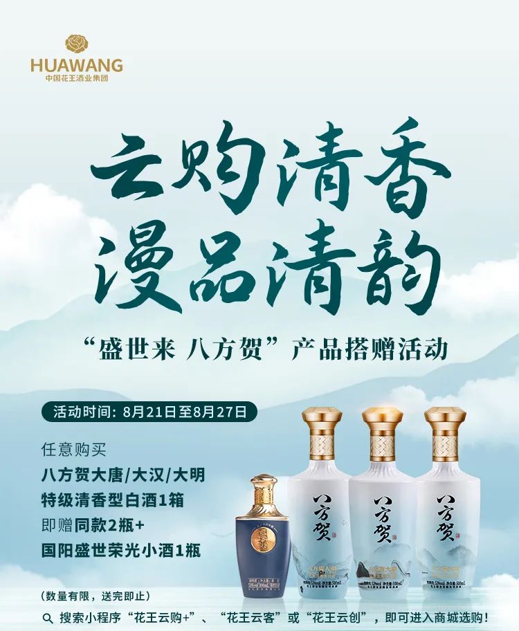 即日起,花王酒业旗下八方贺特级清香型白酒在“花王云购+”、“花王云客”及“花王云创”小程序全面上线,邀您举殇梦回盛唐,漫品清香礼遇。