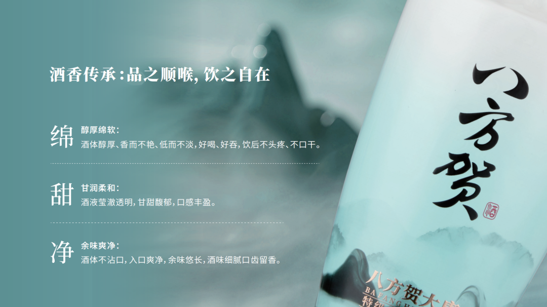 「八方贺特级清香型白酒」,传承中华古法酿造工艺彰显酒体酿造智慧。采用清蒸二次清工艺、地缸发酵、古法蒸馏的传统清蒸发酵法酿造,尽显清香白酒的醇厚绵软、甘润柔和;三款白酒宛如历史的古旧卷轴,在感官的呼唤下,展开了一幅醇香的画卷。