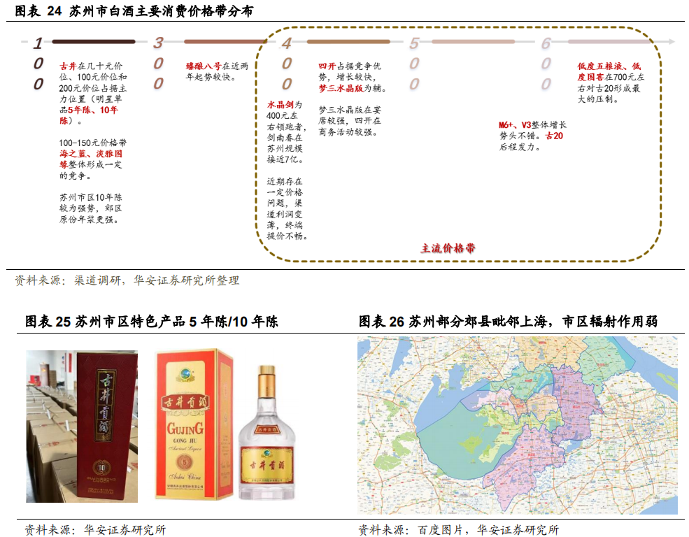 “一高一低”显示苏州特色,外来品牌更显群雄逐鹿。苏州地区整体价格带分布和南京地区类似,属于“地产酒+外来名品”兼而有之的大格局,但部分价格带情况又有所不同。一方面,苏州地区外来名酒品类更多、竞争更为激烈,洋河、今世缘等产品占比相对南京更少,其原因在于苏州外来人口占比较大,对外来品牌的包容度和接受度更广;另一方面,苏州市区和郊县也形成了相对独立的用酒习惯,其原因在于苏州区县毗邻上海等经济发达地区,本身经济实力较强,其他样板市场的辐射作用因此相对减弱。具体来看:800元及以上高端价格带仍旧以飞天茅台、五粮液为主,国窖1573、梦9、国缘V9等也有一定市场份额;700元左右价格带消费者对低度五粮液和低度国窖认可度更高,由于苏州高端宴席及商务活动消费能力较高,消费者愿意付出一定溢价选择五粮液等强品牌力产品,对600元及以下的梦6+、古20等产品形成较强压制;550-700元价格带梦6+、国缘V3市场份额、增长速度都表现较好,由于苏州地区古井次高端推广相对较晚,古20相对起步较晚,因此价格控制相对南京更好;400-500元价格带类似南京地区,国缘四开、梦三水晶版占据主导优势;400元+价位水晶剑仍旧份额较大,渠道反馈苏州地区规模接7亿;100-300元价格带格局与南京差异较大,由于古井贡酒进入苏州地区时间较长,其明星单品5年陈酿和10年陈酿在苏州市区的100-200元价格带牢牢占据消费者心智,导致苏州地区中档酒市场古井较为强势。此外,150元以下的海之蓝和淡雅国缘也有一定的市场份额,同时,外来品牌在这一价格带相比南京更容易形成稳定销量。苏州市场今年同样呈现“两头旺中间弱”的白酒消费格局,导致次高端整体回款和动销稍慢。但渠道同时反馈,二季度以来,宴席场景恢复积极,商务活动的前置场景高档餐厅包厢也预订火爆,显示了苏州地区较强的消费爆发力和经济活动热度。此外,包括苏州在内的苏南地区,今年酱酒消费市场显著回暖,维持了较好的增长势头。酒企方面,苏州作为苏南地区的白酒重镇,吸引了各大酒企进行品鉴、文化宣传等活动,5月20日,“喜相逢·茅台1935”2023年度文化之旅第二站行在苏州召开,彰显茅台文化内涵;5月21日,第二届五粮液和美文化节“姑苏爱情周”活动在苏州圆满召开,宣扬五粮液“和美文化”。